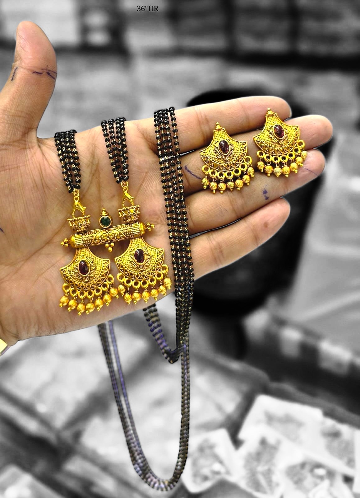 हे मंगळसूत्र काळ्या मण्यांच्या दुहेरी साखळीवर घडवले आहे, जे त्याला महाराष्ट्रीयन सौंदर्य प्रदान करते. यासोबत समरूप डिझाइनचे कानातले (झुंबर) देखील दिलेले आहेत, जे संपूर्ण लुकला साजेसे वाटते. लग्न समारंभ, सण-उत्सव किंवा खास प्रसंगी वापरण्यासाठी हे मंगळसूत्र अत्यंत आकर्षक पर्याय आहे.