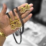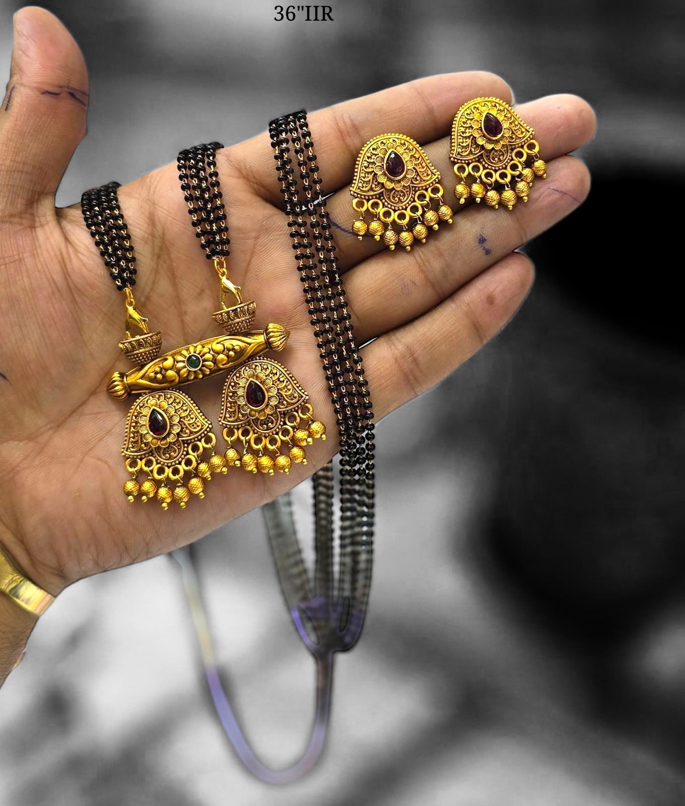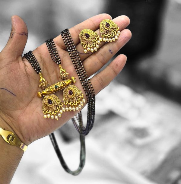 हे मंगळसूत्र काळ्या मण्यांच्या दुहेरी साखळीवर घडवले आहे, जे त्याला महाराष्ट्रीयन सौंदर्य प्रदान करते. यासोबत समरूप डिझाइनचे कानातले (झुंबर) देखील दिलेले आहेत, जे संपूर्ण लुकला साजेसे वाटते. लग्न समारंभ, सण-उत्सव किंवा खास प्रसंगी वापरण्यासाठी हे मंगळसूत्र अत्यंत आकर्षक पर्याय आहे.