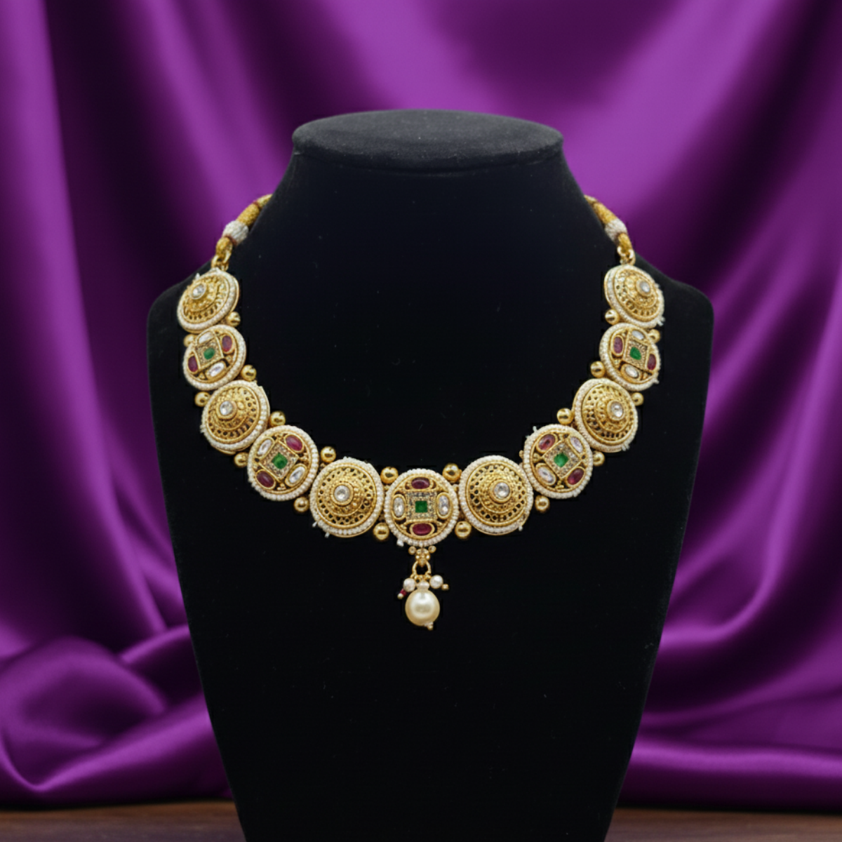 Enhance your ethnic elegance with this Antique Gold-Plated Kundan Round Motif Necklace, crafted with exquisite detail and vibrant color highlights.