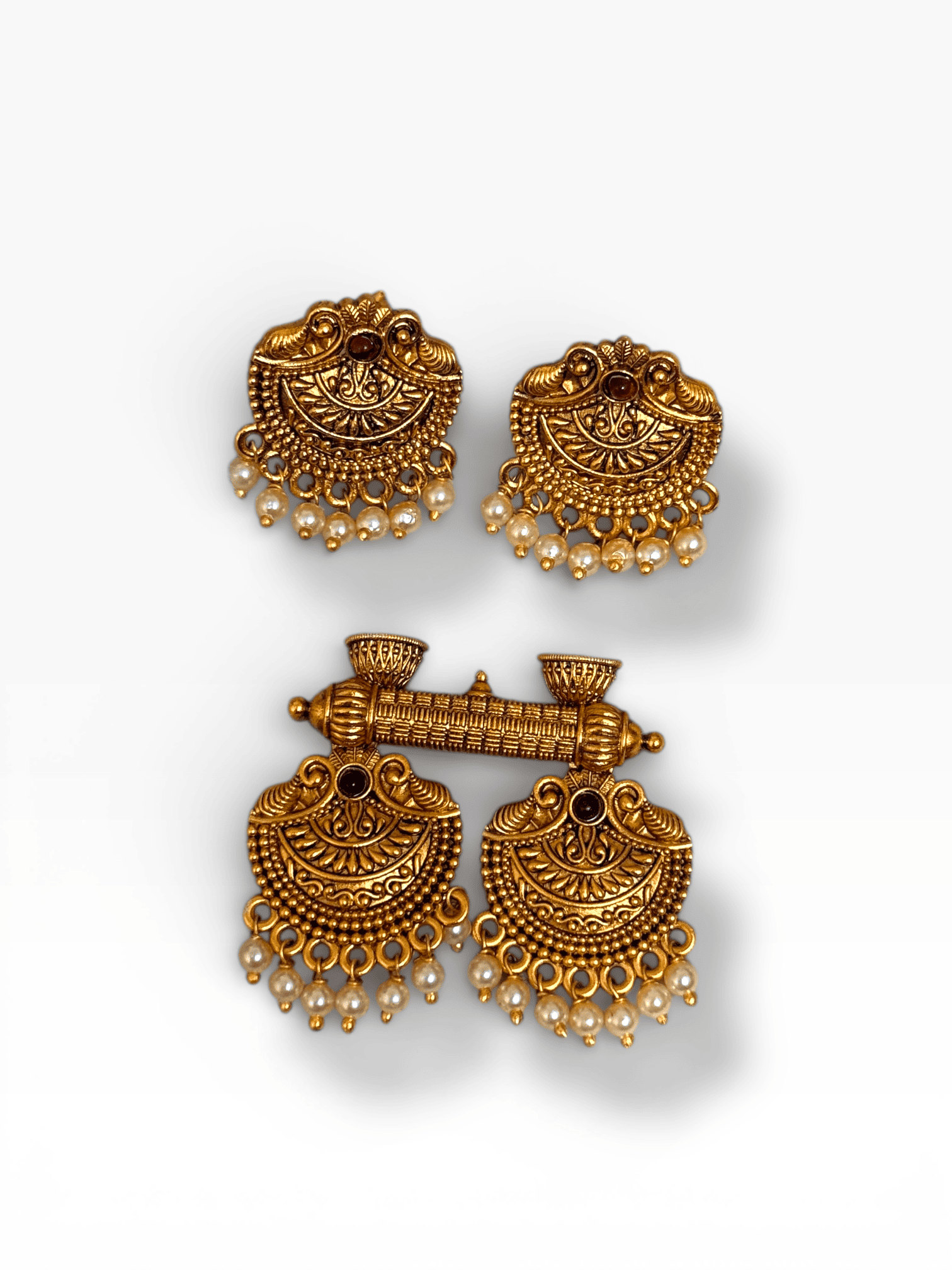 Classic antique matte peacock pendant set featuring traditional temple-style detailing and elegant pearl drops for a royal ethnic look.