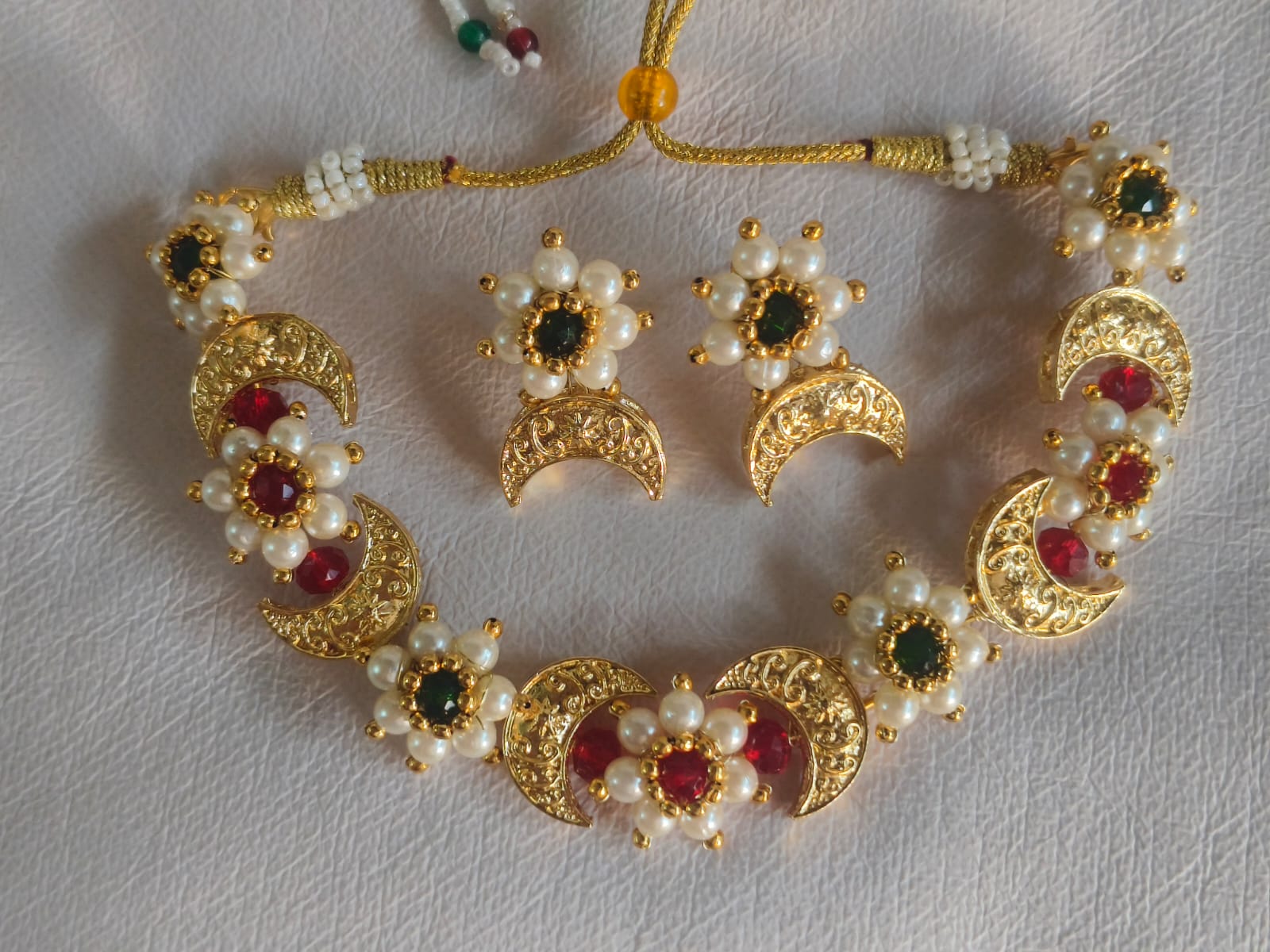 Premium Chandrakor Necklace Set crafted with high-quality artificial metal alloy and elegant gold-tone plating. The necklace is beautifully designed with traditional Chandrakor motifs, adorned with pearl beads, red and green stones, and fine handcrafted detailing that reflects authentic Maharashtrian jewellery style.
