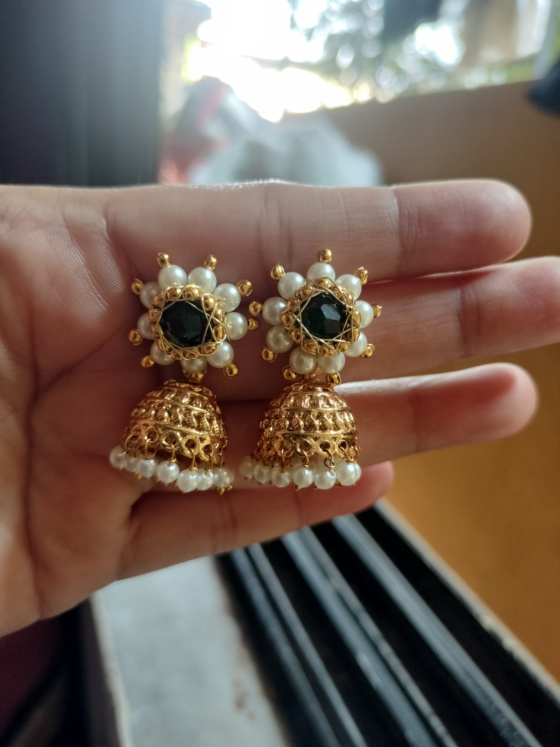 Handmade traditional jhumka earrings with golden finish, pearl border, and black stone detailing. Perfect imitation jewellery for festive and ethnic wear. Price: ₹300.