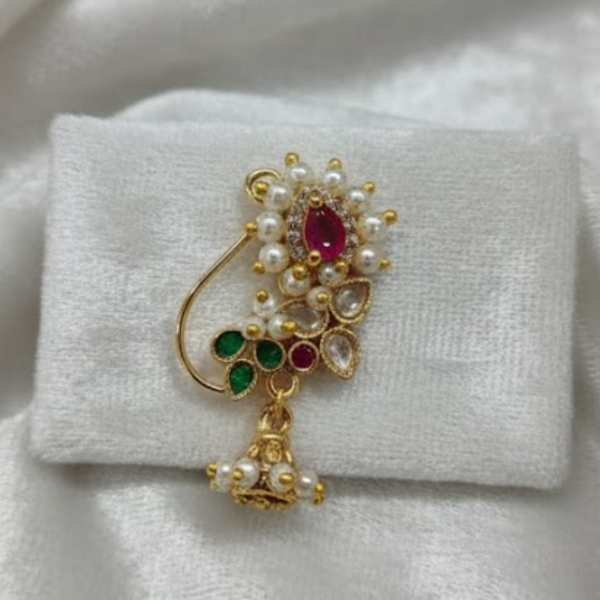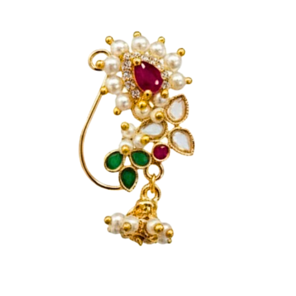 This beautifully designed nose ring features sparkling green and pink stones, surrounded by premium pearl detailing and finished with a graceful pearl jhumka hanging that adds charm with every movement.