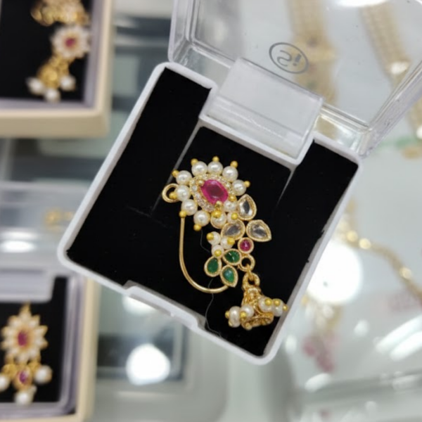 Enhance your traditional look with this stunning Nakharewali Maharashtrian Nath, crafted to reflect royal Marathi culture and bridal elegance.