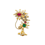 Enhance your traditional look with this Royal Diamond Pearl Nath, inspired by classic Maharashtrian bridal jewellery. This exquisite nose ring features a stunning combination of sparkling diamond-cut stones, a rich ruby red centerpiece, and a vibrant emerald green square stone, giving it a truly royal and graceful appearance.