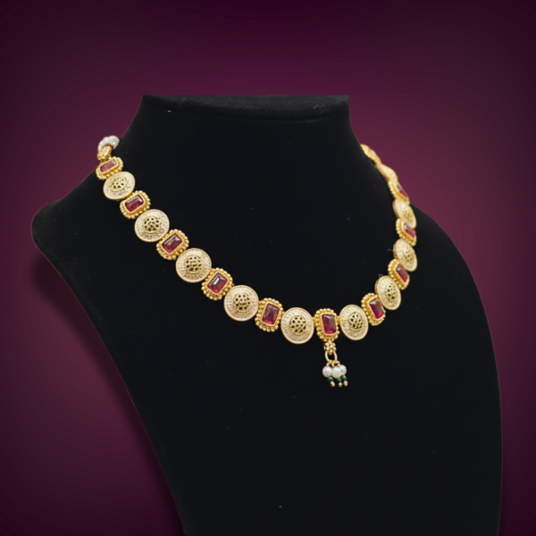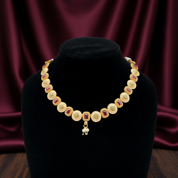 Be the first to review “Royal Gold-Plated Ruby Stone Choker Necklace with Elegant Pendant Drop – Premium Imitation Jewellery”