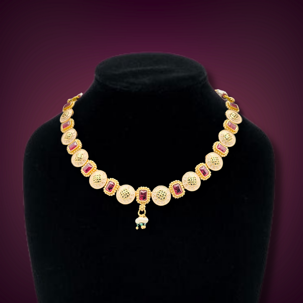 Add a touch of royal elegance to your look with this gold-plated ruby stone choker necklace, beautifully designed with alternating carved motifs and rich ruby accents. Perfect for weddings, festivals, and traditional celebrations—this stunning imitation jewellery piece completes any ethnic outfit with grace and charm.