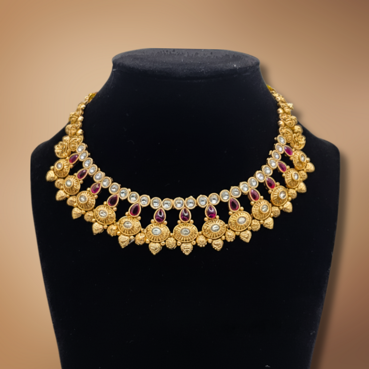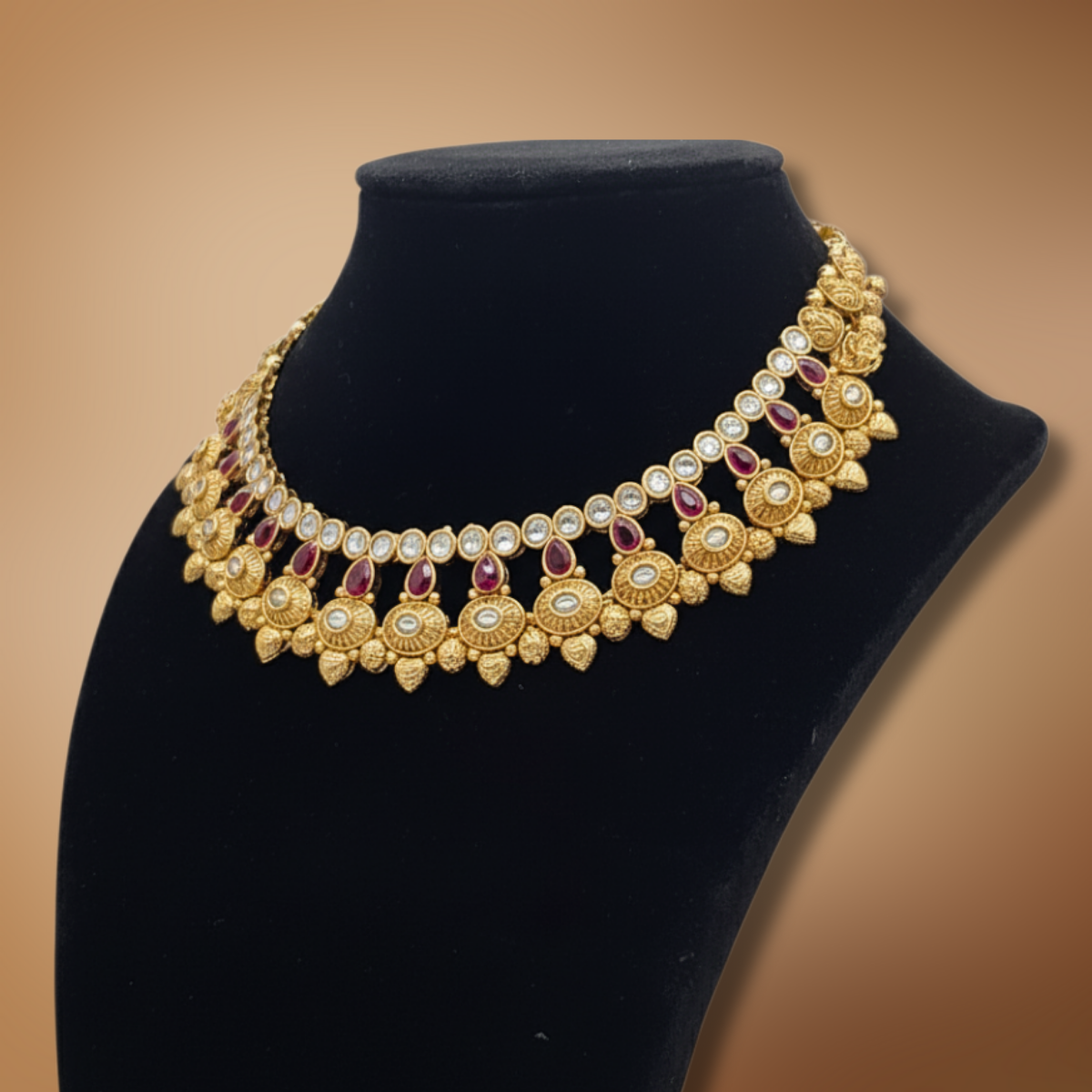 Crafted with intricate detailing, shimmering ruby stones, and lustrous pearl accents, this necklace blends heritage artistry with modern elegance.