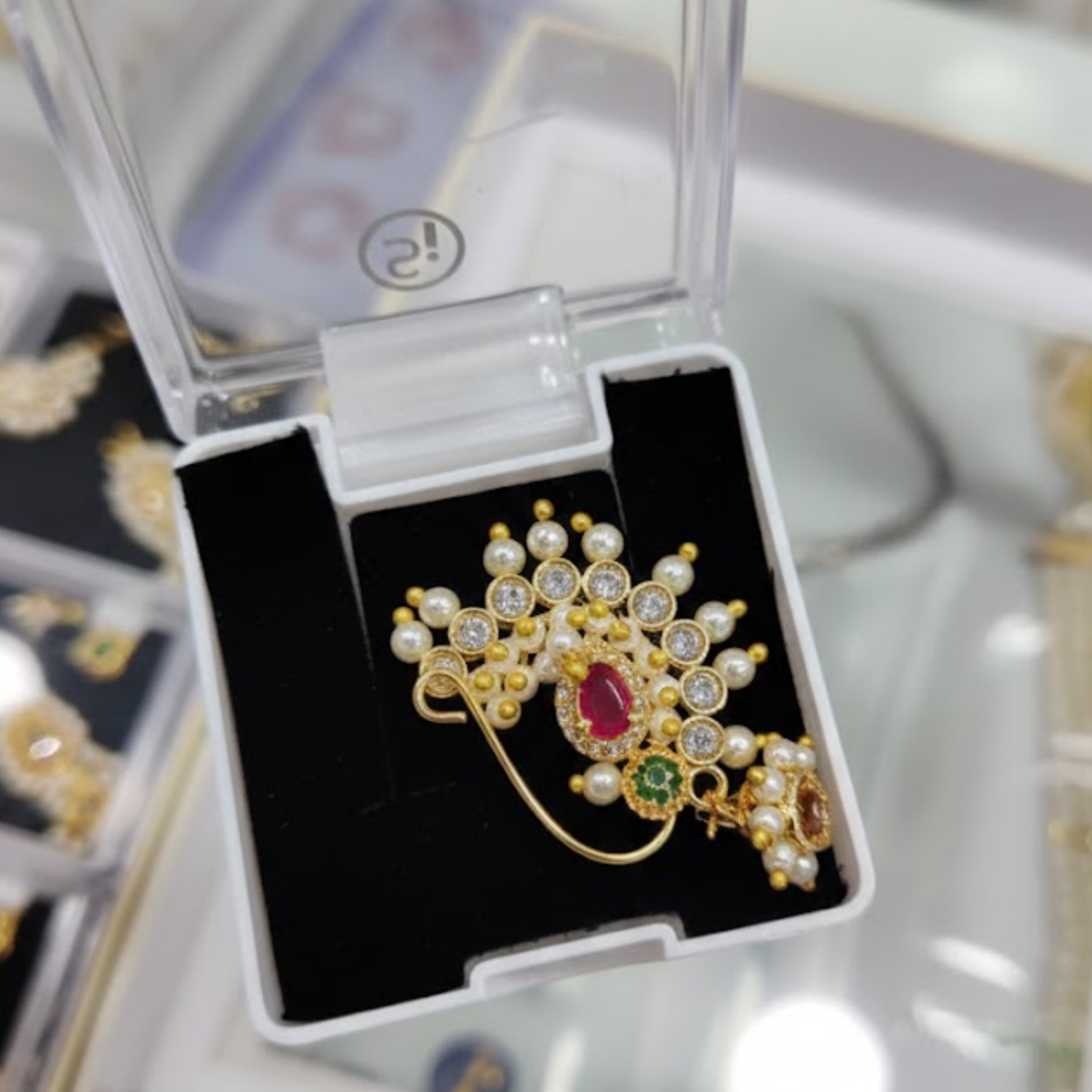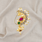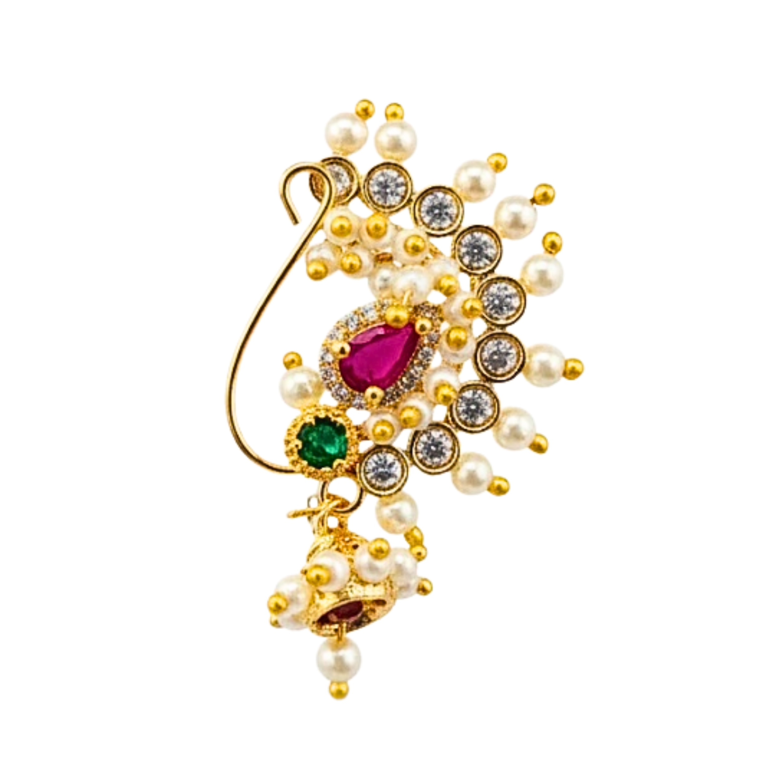 The delicate pearl detailing and jhumka hanging add graceful movement and royal charm, making it an ideal choice for bridal wear, weddings, festivals, and traditional functions. Lightweight and comfortable, this Nath perfectly complements Maharashtrian and ethnic outfits.