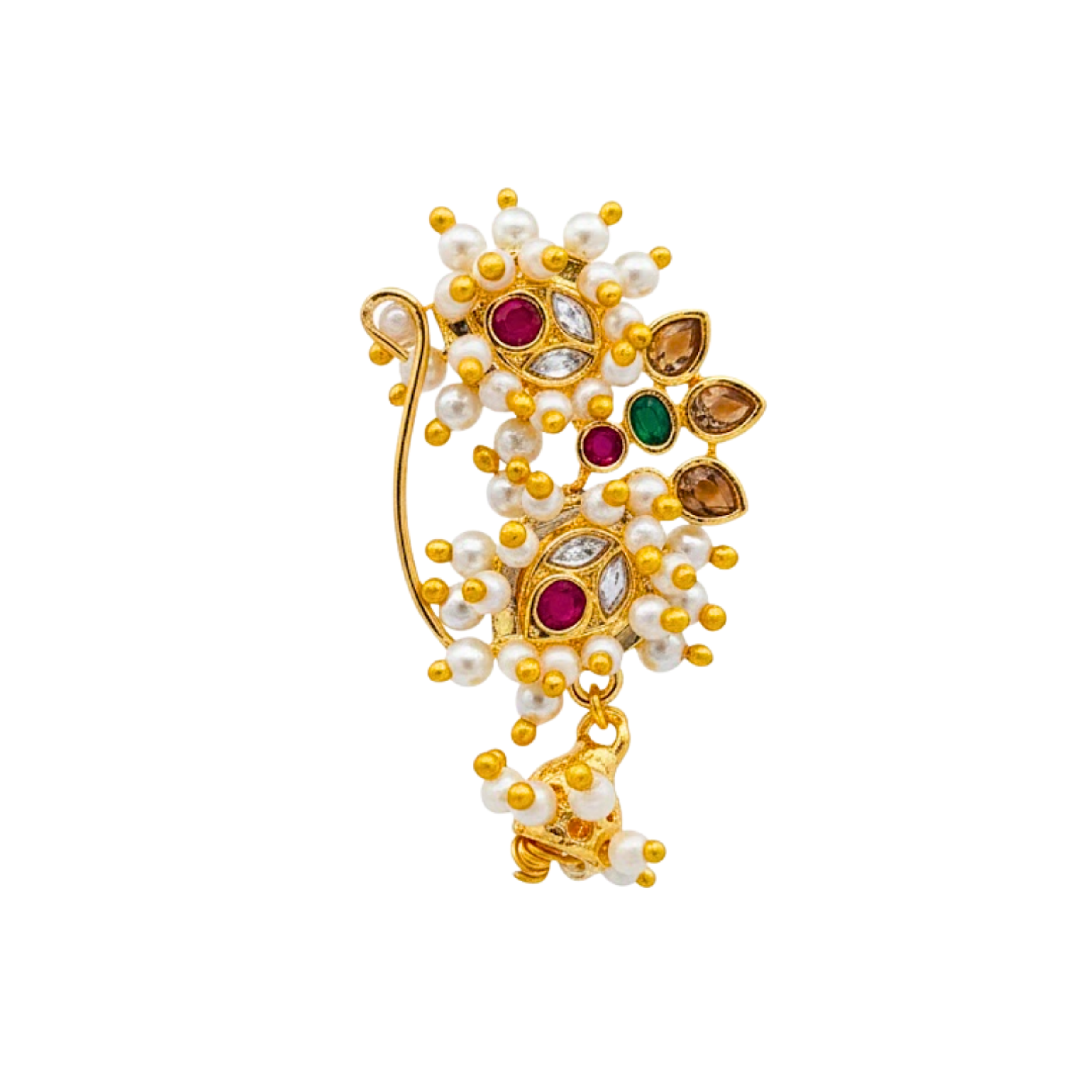 Beautiful traditional Nath designed with pearl detailing, pink & green stones, and elegant jhumka hanging. Perfect for bridal and festive wear.